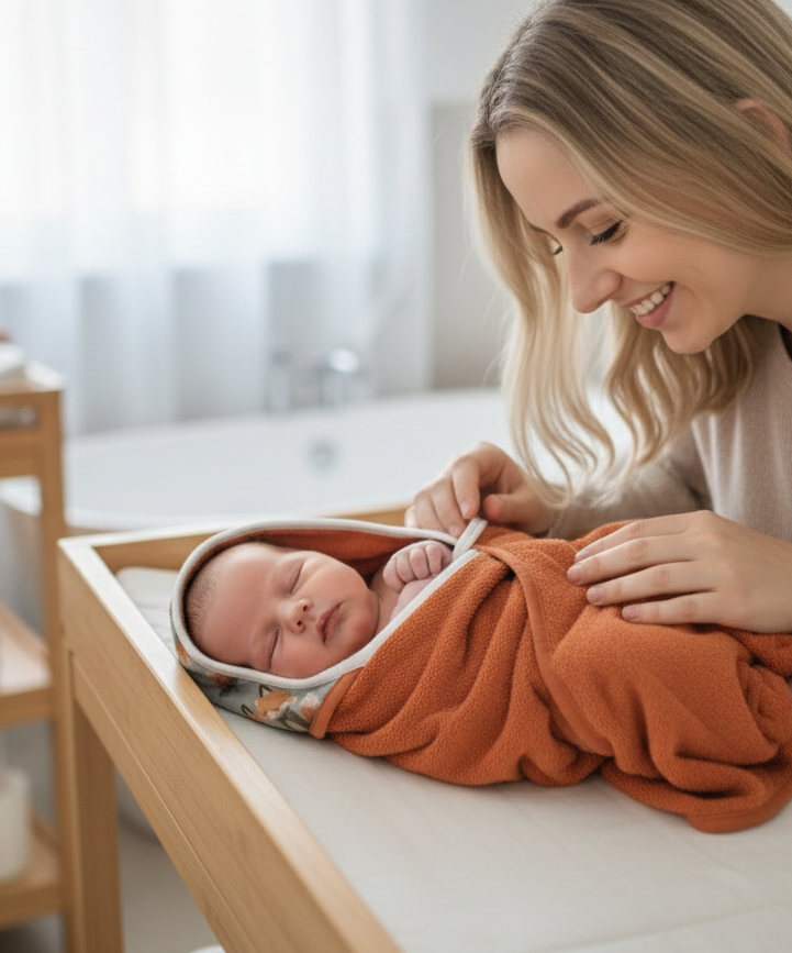 Kit sortie de bain avec 1 grande cape de bain en microfible de bambou de 90x90 cm + 1 gant de toilette.